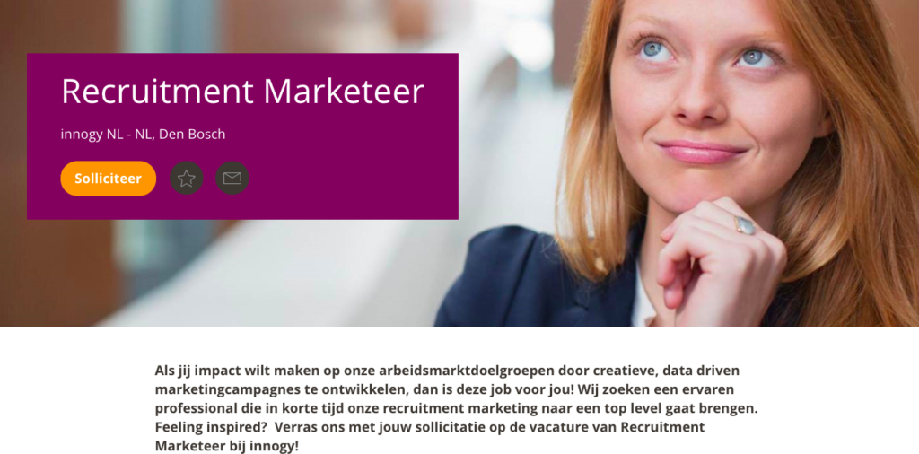 We zien in feite niets. En dat terwijl de vacature toch de plek moet zijn waar we mensen willen verleiden. Van de kandidaten ziet 80 tot 90 procent niets anders dan de vacature. Zeker voor een nieuw merk is dit dus dé plek waar je jouw merk moet zien te verkopen.
