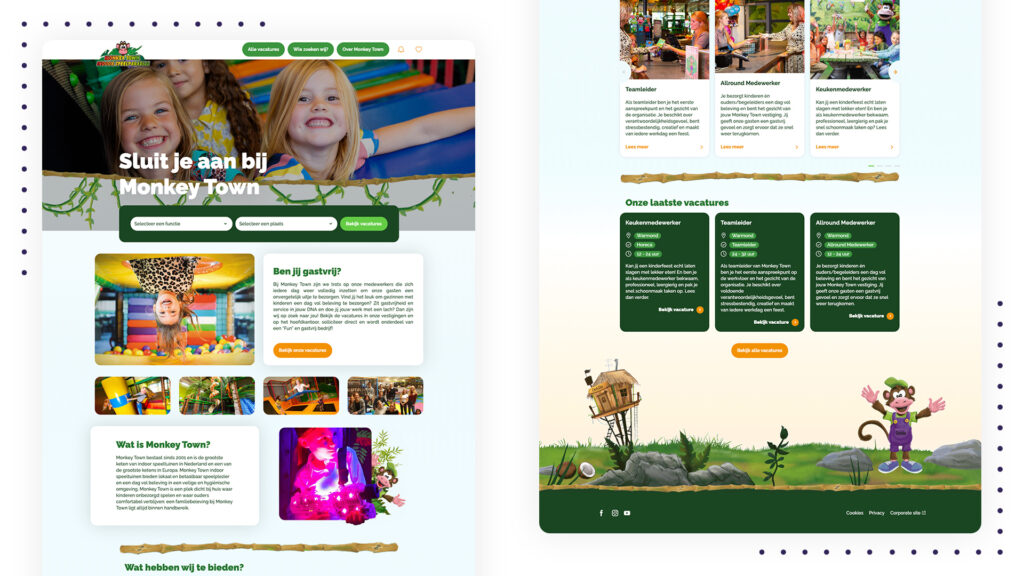 Voorbeeld van die laatste categorie is Monkeytown, de grootste keten van indoor speeltuinen in Nederland. Ook zij starten na corona weer op en merkten veel last te hebben van concurrentie op de arbeidsmarkt, bijvoorbeeld van de horeca en de GGD-vaccinatie- en testcentra. Donders: ‘Zij zeiden: we hebben nu mensen nodig! Kunnen jullie daar snel een goede site voor neerzetten? Dat hebben we daarop gedaan, inclusief een ATS, online marketing en een hiring manager portal, zodat de filialen zelf vacatures live kunnen zetten, en zelf zodra ze sollicitanten binnenkrijgen makkelijk gesprekken kunnen plannen.’