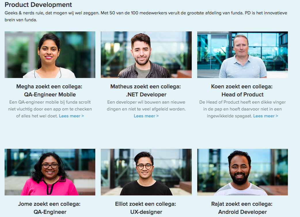 Ook over de opmaak van de vacatures ben ik minder te spreken. Ten eerste begint elke vacature met dezelfde foto, die we nog kennen van de homepage. Een foto waarmee – vermoed ik – slechts een beperkt aantal mensen zich zal identificeren. Ze lijkt ook geen eigen medewerker en ook zeker niet specifiek gericht op het vakgebied. Een gemiste kans.
