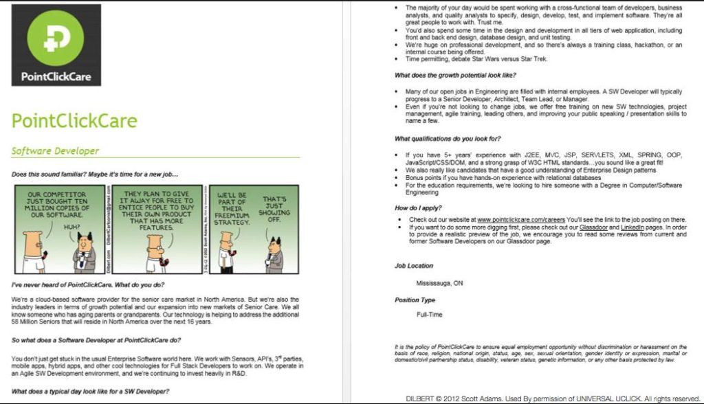 Ook Chris Mulhall van het Canadese softwarebedrijf PointClickCare kende dat onderzoek. En dus besloot hij eens te experimenteren met wat nieuwe manieren om dezelfde boodschap over te brengen, maar dan in een wat frissere, nieuwe verpakking. ‘Want vanuit het perspectief van de kandidaat duidt een saaie, bureaucratische vacaturetekst meestal ook op een saai, bureaucratisch bedrijf.’