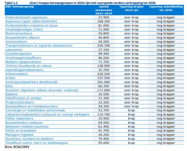 Vooral in de techniek en transportsector zullen de tekorten de komende jaren nog flink blijven, stelt het onderzoek, waaraan ook het Research Centrum voor Onderwijs en Arbeidsmarkt (ROA) heeft bijgedragen. Van de 112 onderzochte beroepsgroepen geldt voor 32 beroepen dat de arbeidsmarkt nu al (zeer) krap is, maar dat tot 2030 nog een grotere krapte op stapel staat. Dit geldt in de transportsector bijvoorbeeld vooral voor transportplanners, vrachtwagenchauffeurs, dekofficieren (assistenten van een kapitein op een schip), bus- en trambestuurders en piloten (!).