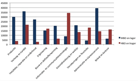 Aantal unieke vacatures per beroepsklasse, gesplitst in vacatures voor lager en hoger opgeleiden, over de periode februari t/m april 2011. Bron: Jobfeed Analytics