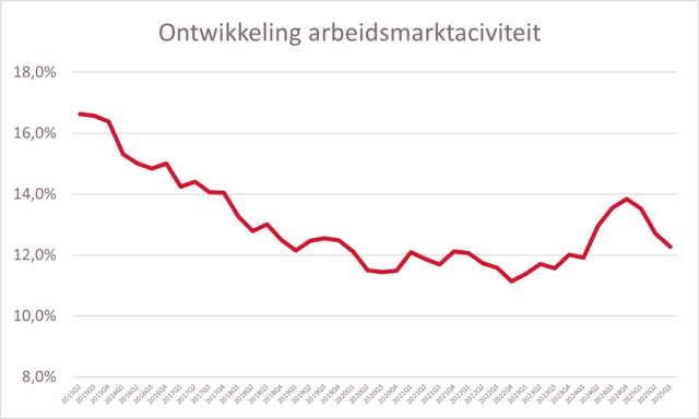 De werkloosheid is inmiddels ook – heel langzaam – aan het stijgen en (net) boven de 400.000 personen gekomen. Met de verdere daling in activiteit en mobiliteit op de arbeidsmarkt is een verdere stijging de komende tijd zeer aannemelijk. Dit beeld wordt bevestigd door de groep latente baanzoekers, die momenteel ook steeds kleiner wordt. Met 43,8% is deze groep nog altijd weliswaar aanzienlijk groter dan die van de actieve baanzoekers, maar dit percentage was sinds de zomer van 2017 niet zo laag.