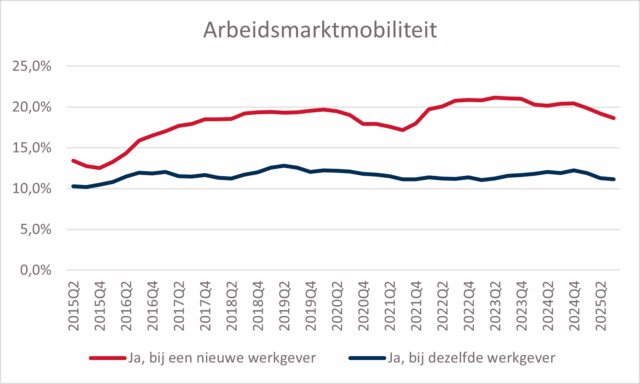 De neergaande trend bij het aantal externe baanwisselingen (naar een andere werkgever dus) zet zich ook in het derde kwartaal van dit jaar door. Er waren minder mensen die nieuw of ander werk hebben gevonden. Het percentage daalde tot 18,6%, het laagste aandeel in bijna 4 jaar tijd. Ook de interne mobiliteit daalde verder naar 11,1%. En ook dit was het laagste punt in 4 jaar tijd.