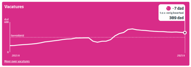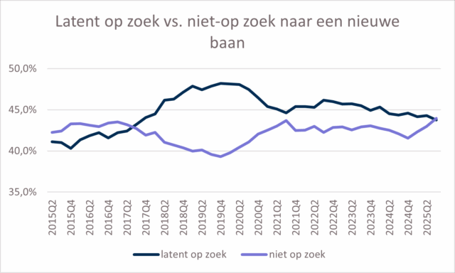 De activiteit en mobiliteit op de arbeidsmarkt zijn doorgaans zeer goede indicatoren van de status van de arbeidsmarkt. Het aandeel mensen dat actief op zoek is naar (ander) werk, kwam in het derde kwartaal uit op 12,3%. Wederom een daling, zowel ten opzichte van het voorgaande kwartaal (12,7%) als in vergelijking met een jaar geleden (13,5%). De stijgende trend die we de afgelopen jaren konden zien is in 2025 duidelijk omgeslagen, blijkt uit onderzoek van Intelligence Group.