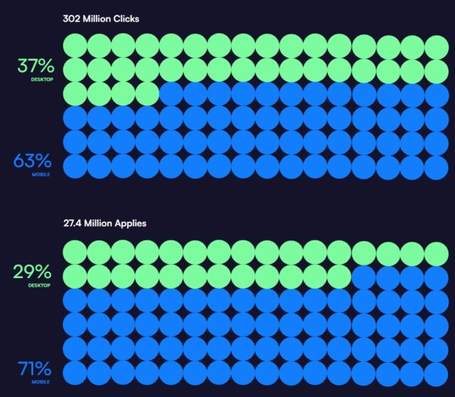Héél opvallend: voor het eerst in jaren is er een daling te zien in het relatieve aantal sollicitaties dat via mobiel binnenkwam. ‘In alle beroepen samen daalde het aantal sollicitaties via mobiele apparaten met 5% en het aantal mobiele klikken met 10%, terwijl het aandeel van desktops in beide toenam.’ Een verklaring hiervoor hebben de onderzoekers overigens ook: het zijn met name white-collar workers die nu solliciteren, en die blijken juist vaak de voorkeur te geven aan het invoeren van data via de desktop.