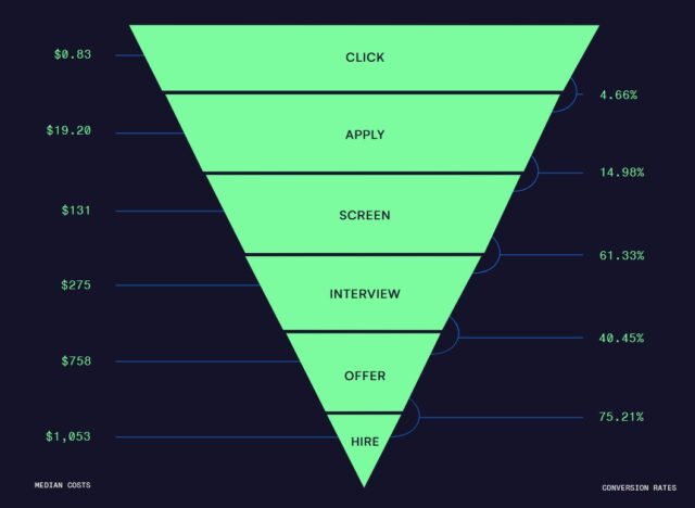 Waar gemiddeld een klik nog geen dollar kost om te realiseren, blijkt uiteindelijk de cost-per-application in het onderzoek uit te komen op zo’n 20 dollar, en de cost-per-hire uiteindelijk zelfs op ruim 1.000 dollar.