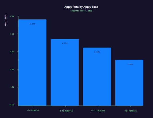 Wat wel nog steeds veel verschil blijkt te maken: de tijd en moeite die het kandidaten kost een sollicitatie af te ronden. ‘Uit data van meerdere jaren blijkt dat vacatures waarvoor een sollicitatietijd van 1 tot 5 minuten geldt, enkele procentpunten hoger scoren dan vacatures waarvoor een sollicitatietijd van 10 minuten of langer geldt. In 2025 bleef dat verschil groot, zonder dat er tekenen waren dat de tolerantie van kandidaten voor trage of complexe sollicitatieprocessen verbeterde. Momenteel dienen werkzoekenden meer sollicitaties in om de juiste functie te vinden, en velen willen geen extra tijd besteden aan wéér een lang formulier invullen.’