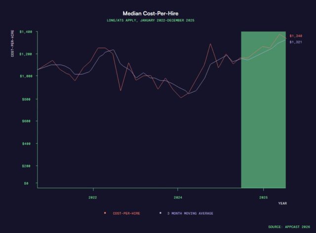 Kunnen de kosten voor recruitment omlaag, als er kandidaten in overvloed zijn? Daar lijkt het voorlopig nog niet op. Uit grootschalig onderzoek van het Amerikaanse Appcast blijkt weliswaar dat het aantal sollicitaties de afgelopen jaren inderdaad flink toeneemt, maar dat bekende metrics als de cost-per-application en de cost-per-hire daardoor helemaal niet direct dalen. Integendeel zelfs. Door de prijsstelling van vacaturesites en LinkedIn en programmatic mediamodellen zaten de kosten in 2025 juist sterk in de lift, zo meldt het onderzoek, gebaseerd op 302 miljoen klikken, 27 miljoen sollicitaties en data van bijna 1.200 werkgevers.
