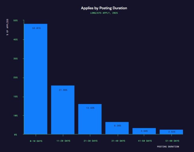 De conclusie voor recruitmentteams is duidelijk, zo stellen de onderzoekers dan ook. ‘Houd het eerste sollicitatieproces kort en plaats niet-essentiële vragen later in de funnel. Het is een makkelijke manier om het aantal sollicitaties te verhogen.’ Wat trouwens in de data ook opvalt: werkzoekenden zijn dol op recent geplaatste vacatures. Meer dan 50% van de sollicitaties komt binnen de eerste 10 dagen binnen. Naarmate vacatures langer online staan, daalt het aantal sollicitaties sterk, tot ongeveer 2,8% tussen de 51 en 60 dagen. ‘Als het aantal sollicitaties stagneert, is het misschien tijd om de vacature te vernieuwen’, concluderen ze dan ook.
