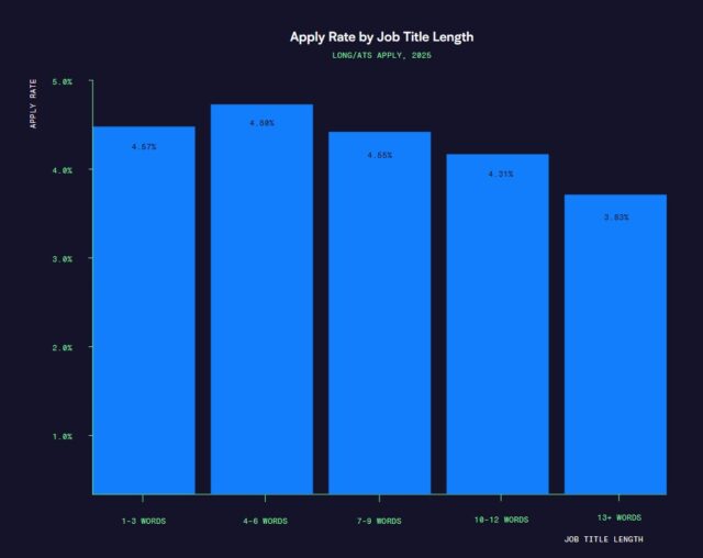 Appcast verzamelt ook al langer allerlei data over vacatureteksten. Daaruit blijkt bijvoorbeeld dat alleen al de lengte van een functietitel best verschil kan maken. Telt een functietitel meer dan 10 woorden? Dan stort het aantal sollicitaties behoorlijk in, zo blijkt. Maar ook een te korte functietitel werkt niet optimaal. ‘Voor werkgevers met functietitels van 1 tot 3 woorden zijn er wellicht mogelijkheden om te experimenteren en te kijken of het toevoegen van wat meer context de relevantie voor kandidaten verbetert en daardoor het aantal sollicitaties verhoogt’, raden de onderzoekers dan ook aan.