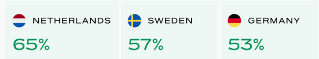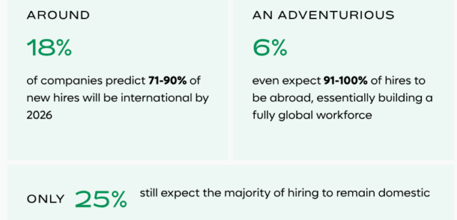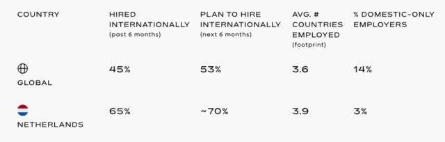 De verschillen in strategieën tussen de 10 onderzochte landen zijn opmerkelijk. Zo zegt 65% van de Nederlandse bedrijven de afgelopen 6 maanden internationaal personeel te hebben aangenomen, gevolgd door Zweden (57%) en Duitsland (53%). Van de Franse bedrijven gaf daarentegen slechts 29% aan hetzelfde te hebben gedaan, terwijl Australië met 34% ook een voorzichtiger aanpak kent. Ondertussen liggen bedrijven in het Verenigd Koninkrijk en de Verenigde Staten dichter bij het wereldwijde gemiddelde, met ongeveer 45 tot 47% die internationaal uitbreidt.