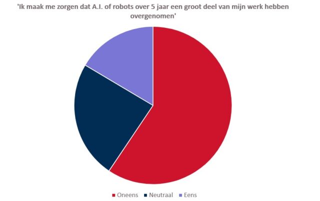 Het sluit nauw aan bij recente cijfers van arbeidsmarktonderzoeksbureau Intelligence Group, die tegenwoordig in hun kwartaalonderzoeken onder de beroepsbevolking ook vragen naar de verwachtingen over de impact van A.I. Zo bleek uit de meest recente cijfers dat men nu al denkt dat gemiddeld 33% van hun werk net zo goed door A.I. kan worden gedaan, vrij gelijkelijk verdeeld over man/vrouw, en alle senioriteits- en opleidingsniveaus. En 1 op de 6 zegt zich zorgen te maken dat A.I. of robots over 5 jaar hun werk zal hebben overgenomen, terwijl minder dan 60% zegt zich hierover (totaal) geen zorgen te maken.