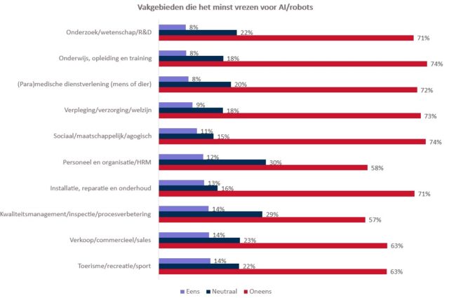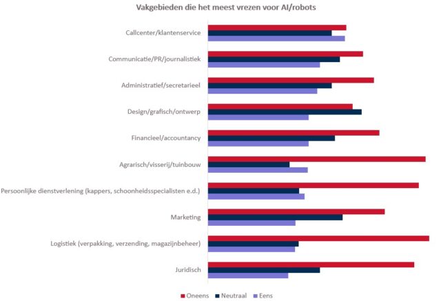 Vooral in het callcenter en bij de klantenservice is de angst groot. Daar denkt 34% dat A.I. of robots binnen 5 jaar hun huidige werk overbodig hebben gemaakt, gevolgd door bijvoorbeeld de beroepsgroepen PR/communicatie en journalistiek (28%), administratief/secretarieel (27%), design/grafisch ontwerp (25%) en financieel/accountancy (25%). In de beroepsgroepen (para)medische dienstverlening; onderwijs, opleiding en training; onderzoek/wetenschap/R&D en verpleging, verzorging en welzijn is die angst juist steeds onder de 10%, terwijl ook de HRM’ers (met 12%) opvallend genoeg denken redelijk buiten schot te kunnen blijven.