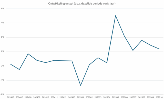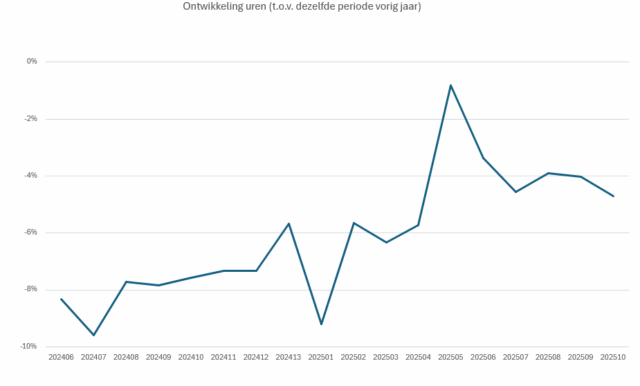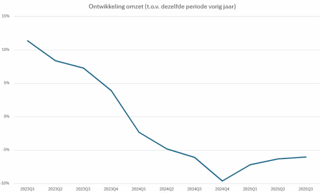 Hoe is het dan bij de detacheerders? Daar zegt ING Research niet specifiek iets over, behalve dat ze ‘om personeel te werven en te behouden steeds vaker investeren in opleidingen en trainingen.’ Ondertussen staan ook hier echter de omzetten nog steeds flink onder druk. In het derde kwartaal van 2025 lag de omzet van Nederlandse detacheerders liefst 6,4% lager dan in dezelfde periode vorig jaar. De daling is minder sterk dan eind 2024, maar is nu toch ook alweer zo’n 2 jaar continu aan de gang. En misschien mag de bodem (in de krimp) bereikt zijn, de weg naar boven lijkt toch ook nog niet echt gevonden.