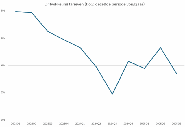 Opvallend is dat detacheerders nu ook aan hun tarieven gaan sleutelen. De gemiddelde tarieven stegen in het derde kwartaal van dit jaar met 3,4%, relatief weinig, vergeleken met de gemiddelde cao-stijgingen en de inflatie. Dit komt bijvoorbeeld doordat vanwege de hoge ‘leegloop’ (gedetacheerden zonder opdracht: afgelopen kwartaal +14,7%) bureaus er eerder voor kiezen gedetacheerden in te zetten op een opdracht tegen een lager tarief. ‘Het is zinvoller om iemand op een mooie opdracht te zetten, desnoods tegen een lagere prijs, dan om de professional op de bank te laten zitten’, aldus Van den Elst.
