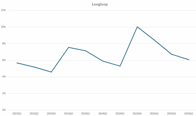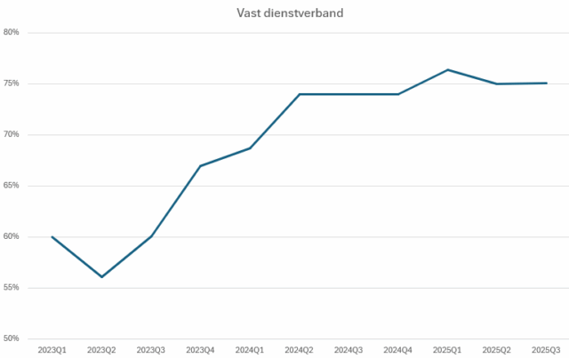 Toch is de leegloop wel een structureel probleem voor de branche. De leegloop volgt een cyclisch patroon, met de meeste leegloop in Q4 van elk jaar. Projecten komen tot hun eind en bedrijven worden wat voorzichtiger in de inzet van nieuwe mensen. Van Q1 tot Q3 valt het percentage dan weer geleidelijk, voordat het weer omhoog schiet. Over de afgelopen jaren wordt het plateau van leegloop echter steeds hoger, van 5,7% (Q1 2023) naar 7,2% (Q1 2024) en 8,4% (Q1 2025).