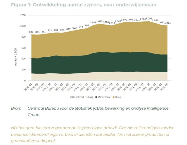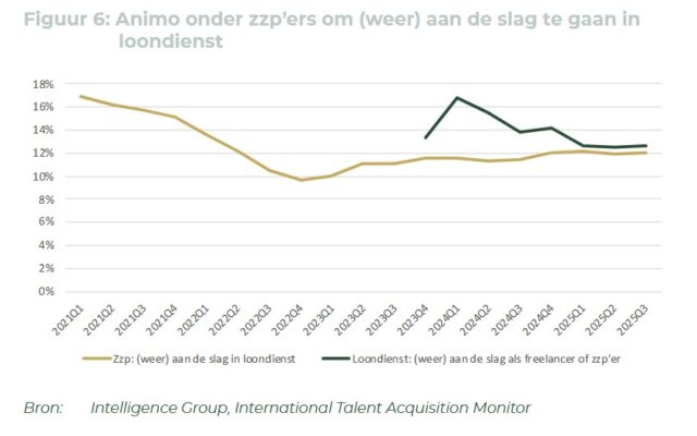 Maar dat is dan wel na een jaar waarin de zzp’er het juist flink voor zijn kiezen kreeg. Uit de meest recente Talent Monitor, een kwartaalrapport van Intelligence Group en HeadFirst Group over de arbeidsmarkt voor zzp’ers, blijkt dat per saldo in 2025 het aantal zzp’ers daalde met circa 80.000 personen, bijna 8% van het totaal. Het aandeel zzp’ers binnen de Nederlandse beroepsbevolking nam daarmee af van 11,1% naar 10,3%. ‘Van een structurele aardverschuiving is nog geen sprake’, concluderen de auteurs van het rapport daaruit, om daar een beetje omineus aan toe te voegen: ‘al kan 2026 hierin een omslagjaar worden’.