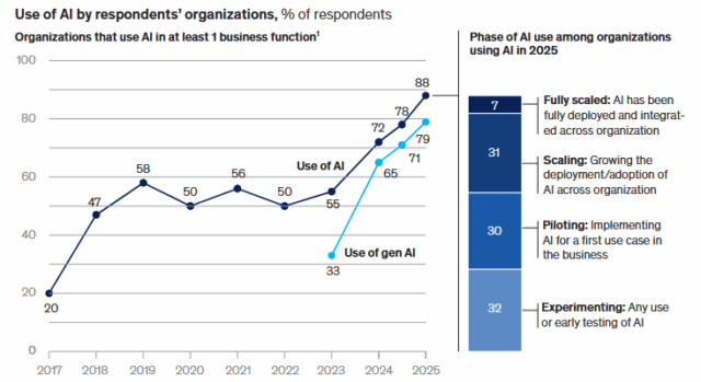 De laatste cijfers van 2025 markeren een definitieve breuklijn in de digitale transformatie. Waar 2024 in het teken stond van experimenteren met Generatieve AI als ’tool’, verschuift de focus eind 2025 naar structurele implementatie. Deloitte typeert deze fase treffend als The Great Rebuild. Het onderscheid tussen koplopers en volgers wordt niet langer bepaald door de technologie zelf, maar door het organisatieontwerp. Uit de State of AI van McKinsey blijkt dat high performers 3 keer zo geneigd zijn hun workflows fundamenteel te herontwerpen rondom A.I. en dat juist dit herontwerp de grootste impact heeft op de resultaten.