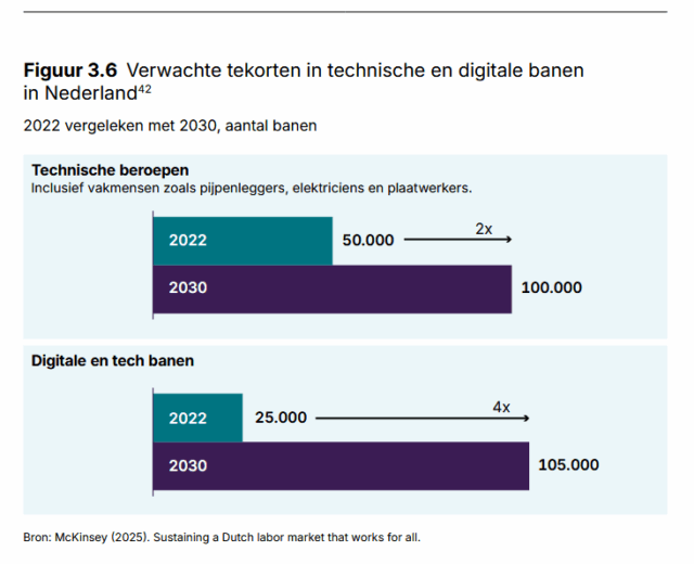 schaarser. We hebben geen gestructureerde om- en bijscholingsmogelijkheden die de vaardigheden van onze beroepsbevolking beter laten aansluiten bij de veranderende vraag’, constateert hij. ‘En we ontmoedigen internationale studenten en kenniswerkers die een deel van dit gat kunnen opvullen steeds meer.’