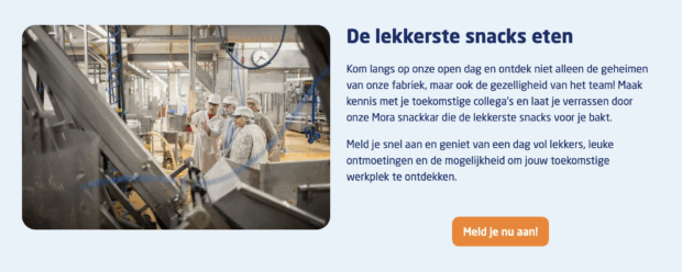 Van Geloven, naar eigen zeggen de grootste snackfabrikant van Europa, met inmiddels bijna 1.500 medewerkers in Nederland en België en bekend van merken als Mora en Van Dobben, pakt het in de productiebranche opvallend open aan. Geïnteresseerden kunnen zich inschrijven voor een open dag in de fabriek, waar ze de productielijn kunnen zien draaien, medewerkers spreken en ervaren hoe het werk eraan toegaat. Tussen de snacks en machines krijg je een eerlijk beeld van een eventuele toekomst. Als je geluk hebt mag je ook letterlijk wat sfeer proeven. Ook open sollicitaties worden er met nadruk verwelkomd.