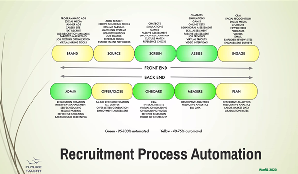 Een nieuwe generatie tooling die daarop volgt zijn de programmatic advertising-modules die buiten Europa steeds meer de norm zijn, zoals bij TMP Worldwide. Of denk aan een partij als Recruitment Accelerator, met hun geautomatiseerde vacature-intake. En dan heb ik het nog niet gehad over chatbots, of geautomatiseerde ‘hunttooling’. Aan de selectiekant is ook een versnelling te zien in de adoptie van automatische matching, e-assessments, integratie van A.I., en gamificering. Hier lijkt de RPA zelfs steeds sneller te gaan.