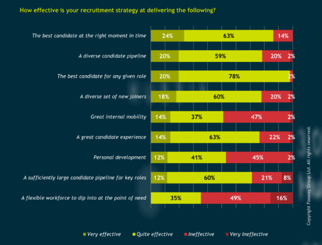 Dat wordt nog eens onderstreept als de respondenten gevraagd wordt of ze zelf hun inspanningen effectief vinden. Dan blijkt dat elke keer minder dan een kwart zichzelf op een bepaald onderdeel van een recruitmentstrategie ‘zeer effectief’ vindt. Als het gaat om het aanboren van een flexibele workforce vindt bijna twee derde (65%) zichzelf (zeer) ineffectief, als het gaat om interne mobiliteit is dat ongeveer de helft (49%). De boodschap is dan ook duidelijk, concluderen de onderzoekers: ‘Er is nog een hoop werk te doen voor recruiters om te bewijzen dat ze het potentieel van intern talent ook serieus nemen.’