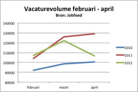 Het totaal aantal vacatures is met 6,6% gedaald in de periode februari 2012 – april 2012 vergeleken met dezelfde periode een jaar eerder. Met name april toont een flinke daling. Het mislukken van het Catshuisberaad en het vallen van het kabinet hebben een zichtbare uitwerking gehad op het vacaturevolume. Het door Jobfeed ook wel genoemde ‘Catshuiseffect’.