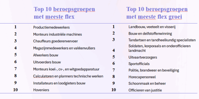 Ook de huidige arbeidsmarkt kent nog genoeg groeiers in de flexbranche, zo maakte Dobbe-Veldkamp duidelijk. Zeker voor specialisten en niches. Bureaus als Easyway, Raaak Personeel, Select, A+ Personeel, All About Work en Berenvriendjes laten bijvoorbeeld allemaal nog een groei in vacatures zien, terwijl voor beroepen als productiemedewerkers, monteurs, chauffeurs, magazijnmedewerkers en vakkenvullers een steeds groter deel van de vacatures op een flexibele manier wordt vervuld, steeds vaker ook via bijvoorbeeld platforms.