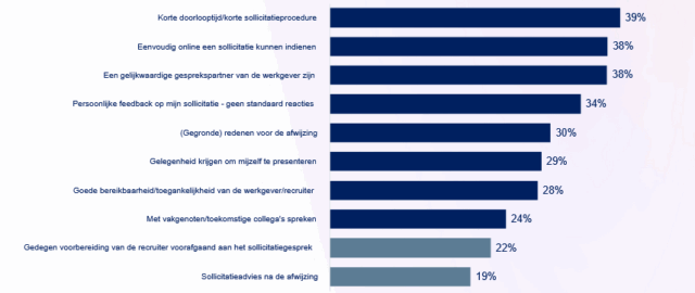 De succesformule? Die is niet makkelijk te geven en verandert bovendien continu, aldus Dobbe-Veldkamp. Maar ze ziet in haar onderzoek wel waar kandidaten van nu vooral naar op zoek zijn, en dat blijkt dan met name: korte doorlooptijden, eenvoudig online kunnen solliciteren, een gelijkwaardig gesprekspartner van de werkgever zijn, en – ook heel belangrijk: persoonlijke feedback op sollicitaties, ‘geen standaardreacties’. Ook een ontmoeting met de hiring manager staat hoog op het verlanglijstje van menig kandidaat, net als de gelegenheid om jezelf te kunnen presenteren, en met vakgenoten/toekomstige collega’s te kunnen spreken.
