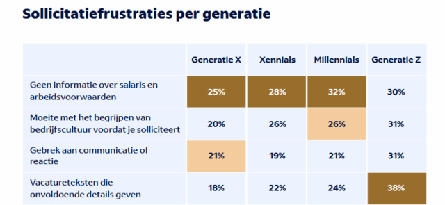 De cijfers laten verder duidelijk zien dat verschillende generaties verschillende behoeftes hebben. Dat biedt kansen: wie zijn arbeidsvoorwaarden en communicatie afstemt op de doelgroep, kan zich onderscheiden op de arbeidsmarkt. Het onderzoek geeft ook inzicht in de struikelblokken tijdens het sollicitatieproces. Bijna de helft van de sollicitanten (49%) haakt af als ze binnen 2 tot 4 weken geen aanbod krijgen. De grootste frustraties: geen salarisinformatie in de vacature, onduidelijke functie-eisen en gebrek aan communicatie.