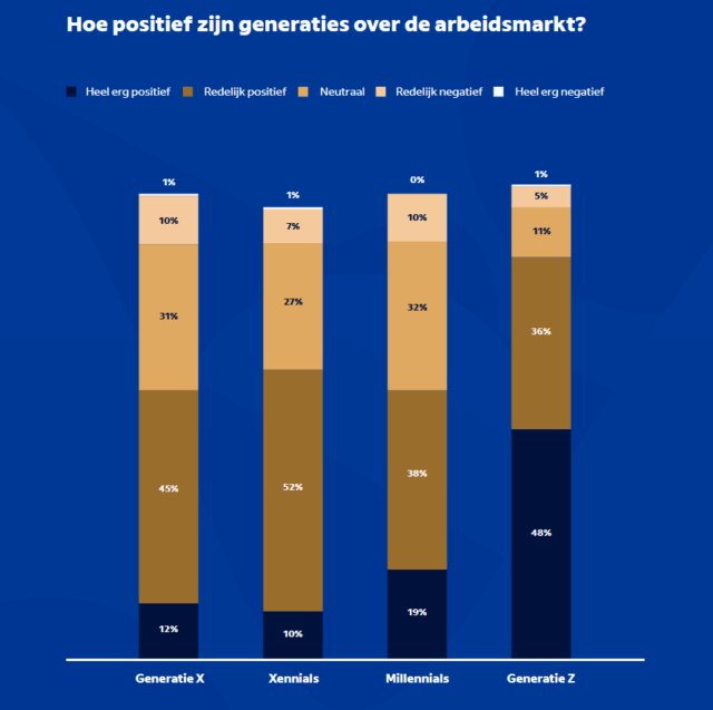 Opvallend is ook het optimisme onder de jongste generatie: 84% van Gen Z beoordeelt de arbeidsmarkt positief. Bij xennials (geboren tussen 1977 en 1983) zakt dat naar 62%, bij millennials en generatie X naar 57%. Gen Z steekt er met kop en schouders bovenuit, een verschil van 27 procentpunten met generatie X. Worden we kritischer met de jaren?