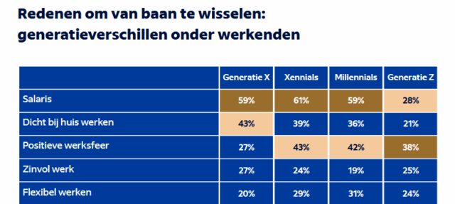 Waar salaris voor de gemiddelde werknemer bijvoorbeeld nog altijd de belangrijkste reden is om van baan te wisselen, blijkt Gen Z daar anders over te denken. Voor hen staat werksfeer op nummer 1. Een opmerkelijke verandering die laat zien dat de jongste generatie werkenden andere prioriteiten stelt. Ook qua arbeidsvoorwaarden lopen de wensen uiteen. Waar oudere generaties vooral waarde hechten aan een dertiende maand en pensioenregelingen, focust Gen Z juist op leer- en ontwikkelbudget. Ze willen groeien, niet stilstaan.