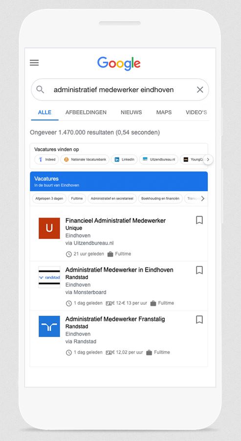Bertisen: ‘Steeds meer mensen zoeken een baan. Google speelt daar vaak een rol in. Maar als we eerlijk zijn, hebben we dat niet altijd even goed gedaan. Deze nieuwe mogelijkheid moet dat verbeteren. Vandaar dat we in Nederland ook functies toevoegen, zoals het mogelijk opslaan van zoekresultaten en een carrousel met directe links naar aanbieders van vacatures.’
