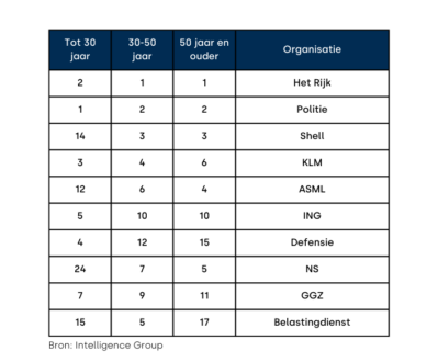Shell mag goed liggen bij 30-plussers, jongeren hebben minder op met deze grote Nederlandse multinational. Ook de ‘schone’ NS is overigens niet erg in trek bij de jongeren, met een 24ste plek (bij veertigers plaats 7). Banken als ING (5), Rabobank (10) en ABN Amro (11) hoeven zich geen zorgen te maken over de aanwas van jeugdig talent: zij blijken er nog altijd goed op te staan bij jongeren. Ook bij Defensie kunnen ze opgelucht ademhalen: onder twintigers staan ze op plek 4.