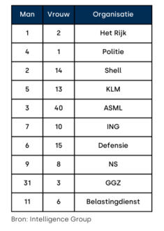 Vergeleken met mannen kiezen vrouwen overigens maatschappelijk bewuster. Werkgevers die veel kritiek krijgen rondom thema’s als klimaat en milieu, zoals Shell, KLM en Schiphol, staan bij de heren op respectievelijk 2, 5 en 15, bij de vrouwen op 14, 13 en 81. Techneutenmagneet ASML gaat van 3 bij de mannen naar positie 40 van de dames. Omgekeerd doet de zorgsector het dan weer veel beter bij vrouwen, zie bijvoorbeeld de GGD (5 vs 29) en GGZ (3 vs 31). Is er dan niets wat parallel loopt? Jawel, de gemeenten en het Rijk (overheden) scoren even goed bij beide seksen.