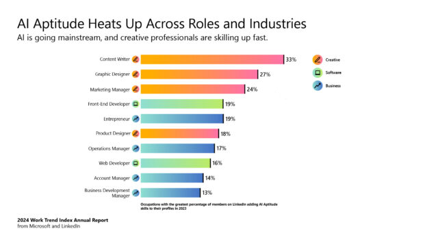 Het zijn vooral de creatieve beroepen die op LinkedIn het afgelopen jaar hebben toegevoegd dat ze over A.I.-skills beschikken, zo blijkt uit het onderzoek. Daarnaast blijkt dat vacatures waarin kunstmatige intelligentie of generatieve A.I. staat genoemd, de afgelopen 2 jaar gemiddeld 17% meer sollicitaties hebben opgeleverd dan vacatures waarin dit niet is genoemd. En zo’n 22% van de recruiters zegt dat ze functiebeschrijvingen aan het bijwerken zijn om het gebruik van generatieve AI in de functie te weerspiegelen, terwijl 12% zegt nieuwe functies te creëren die samenhangen met generatieve A.I.