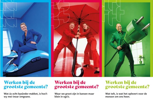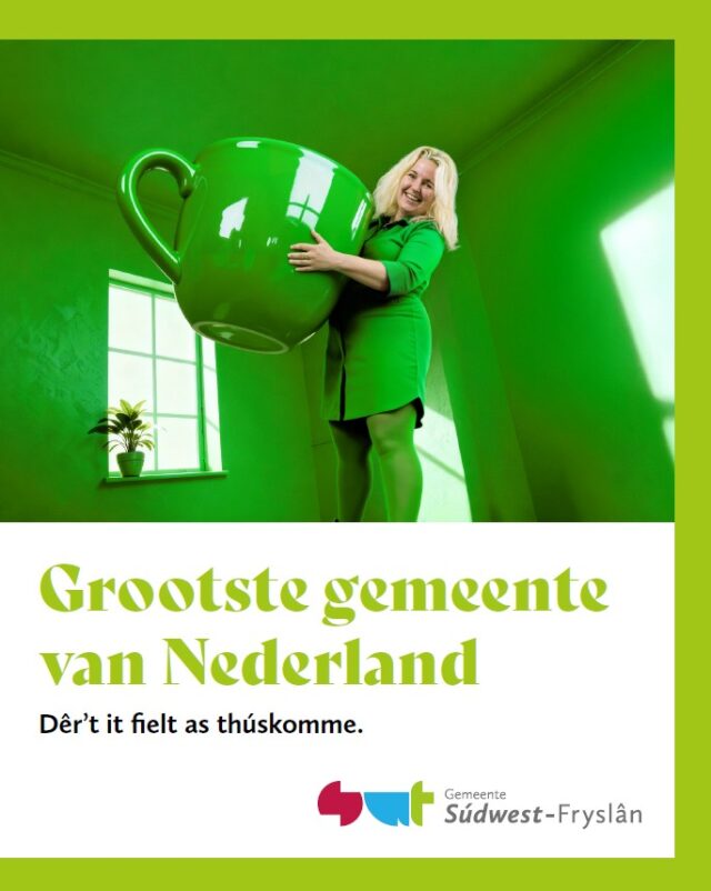 Dat ze de grootste gemeente zijn, gebruiken ze dus wel nadrukkelijk ‘als haakje’ in de kleurrijke campagne die recent gestart is. Maar tegelijk proberen ze dus wel meteen nuance aan te brengen, aldus Abresch. Bijvoorbeeld door te zeggen dat de ambtenaren in de gemeente ‘liever aanpakken dan opscheppen’. Of door ’te laten zien dat we groot zijn in kansen en verantwoordelijkheid, maar klein in ego’s. Groot in gebied en thema’s, dichtbij in samenwerking. Of dat hier werken niet voelt als werken in een anonieme organisatie, maar als onderdeel van een betrokken geheel, waar beleid niet in de lucht blijft hangen, maar zichtbaar landt in dorpen, wijken en bij inwoners.’
