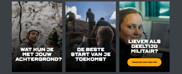 Maar dan, over naar de grootste verandering voor dit jaar: de overstap naar meer aanbodgedreven werving. Oftewel: het kijken naar wat een kandidaat allemaal kan, en daar een passende functie bij zoeken. Maar een probleem diende zich daarbij al wel snel aan, merkte Burgwal. ‘We waren bezig met een HR-vlootschouw. Toen kwamen we erachter dat er 20.000 verschillende functies zijn bij Defensie, op 80.000 medewerkers, echt bizar veel. Een ware wildgroei aan van alles en nog wat. En dan hadden we ook vaak te maken met militaire taken skills, die meestal lastig te matchen zijn met wat op de rest van de arbeidsmarkt gewoon is.’