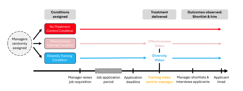Het onderzoek werd uitgevoerd bij 2 grote multinationals. De eerste interventie werd getest bij een wereldwijd telecombedrijf. In een periode van 6 maanden in 2022 werden meer dan 3.000 managers van het bedrijf, die meer dan 10.000 openstaande vacatures hadden, willekeurig toegewezen aan het bekijken van een korte trainingsvideo voordat ze de ingediende sollicitaties beoordeelden en kandidaten uitnodigden voor een gesprek, of aan het doorgaan met de wervingsprocedure zoals gebruikelijk.