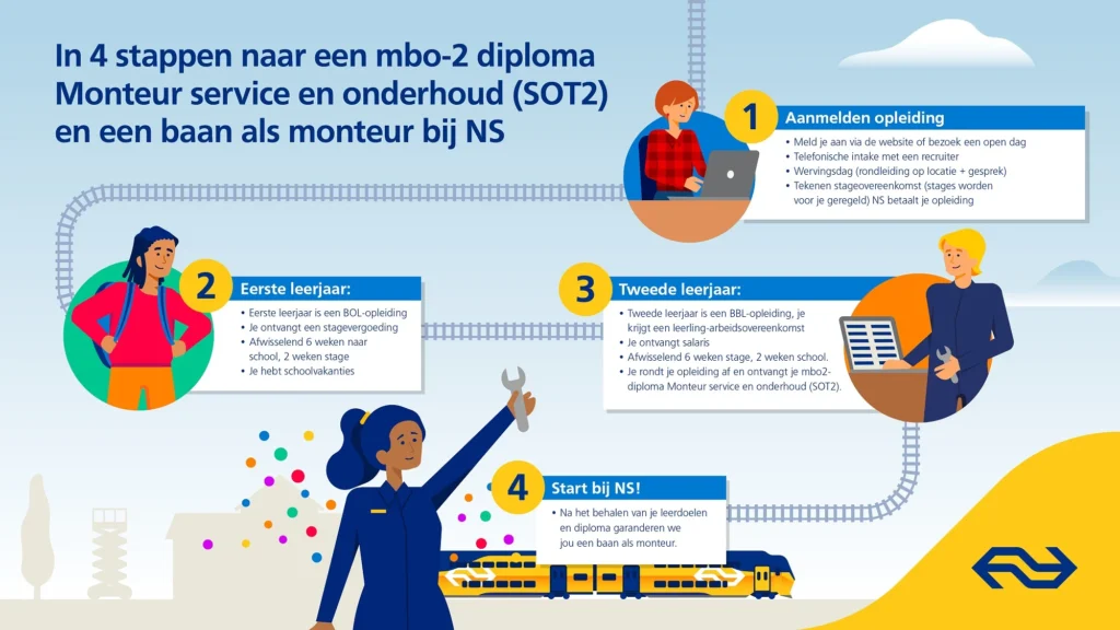 Met de ‘Train je skills‘-campagne (let op de woordspeling) wisten de Spoorwegen dit domein succesvol te claimen, en talloze jongeren aan te trekken voor een eigen mbo-opleiding, door te laten zien wat voor techniek er allemaal komt kijken bij het laten rijden van treinen. In 3 zogeheten ‘TechniekFabrieken’, in Zwolle, Amsterdam en het Brabantse Berkel-Enschot kunnen jongeren in opleiding, in het tweede jaar al salaris krijgen, hun studiekosten door NS betaald krijgen en na afloop van de studie gegarandeerd een baan als monteur bij NS krijgen.