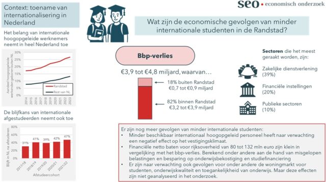 Uit het SEO-onderzoek blijkt bijvoorbeeld dat 25% van de afgestudeerde internationals na 5 jaar nog steeds in Nederland woont, van wie 80% met een betaalde baan. Als we daar de rem op zetten, kunnen veel bedrijven met veel buitenlandse kenniswerkers wel eens overwegen om groeiplannen of activiteiten naar het buitenland te verplaatsen, zo is de vrees. Ook waarschuwen de onderzoekers ervoor dat minder beschikbaar internationaal talent nog meer druk zal zetten op het Nederlandse vestigingsklimaat, dat toch al onder druk staat.