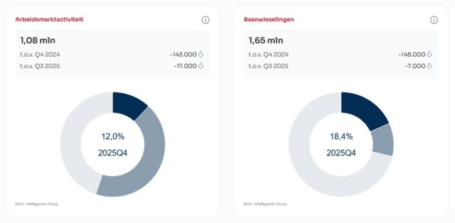 Maar als het gaat om het aantal vacatures, constateerde ook het Centraal Bureau voor de Statistiek, net als Indeed, een daling. ‘Het aantal vacatures nam in het vierde kwartaal van 2025 af met 7.000’, aldus het CBS. De spanning op de arbeidsmarkt neemt hierdoor af; voor elke 100 werklozen zijn er nu nog maar 93 openstaande vacatures, terwijl dit aantal juist lange tijd ervoor boven de 100 lag. In het vierde kwartaal van 2025 ontstonden er volgens het CBS 350.000 nieuwe vacatures, 6.000 minder dan in het derde kwartaal.