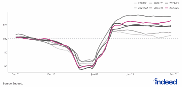 De verandering op de arbeidsmarkt laat zich gelden. Uit nieuwe data van Indeed blijkt wat je ook op andere plekken al merkt: mínder (online) vacatures, en tegelijkertijd méér sollicitanten. Uit de data blijkt dat werkzoekenden eind januari maar liefst 27% vaker naar een baan zochten dan in de eerste helft van december. Dit is de sterkste ‘januari-opleving’ van de afgelopen jaren, aldus Indeed. Dit jaar overtreffen werkzoekenden niet alleen het niveau van vorig jaar (+23%), maar ook dat van 2024 (+21%). En het blijft niet bij zoeken alleen. In vrijwel alle beroepscategorieën steeg ook het aantal daadwerkelijke sollicitaties in diezelfde maand.