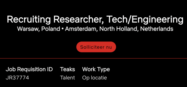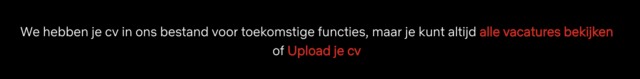 Ik blijf het idee goed vinden, vacatures op maat aanbieden. Visueel is dit ook goed gedaan, dat kun je wel aan Netflix overlaten. Maar in de uitvoering is (zeker) op 2 manieren nog winst te behalen. Ten eerste heb ik inmiddels 15 tot 20 keer de cookies moeten accepteren. Ten tweede natuurlijk het ‘we hebben je cv nu’ zonder dat je daar vooraf iets over hoort of zelfs weet hoe lang ze die nu gaan behouden.