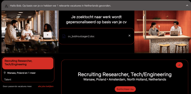 Laten we dus maar even een hertest doen. Is het misschien het ‘junior’ in mijn cv dat het probleem is? Of is de matching gewoon echt heel matig? Dus dan maar proberen met een cv waar ik na mijn junior recruitmentfunctie ook nog twee gewone recruitmentfuncties heb gedaan. Het resultaat is nu wel anders. Het gaat dus om meer dan keyword matching, blijkbaar is het junior deel het issue. Ergens is dit knap, ik kan niet anders zeggen, het systeem begrijpt meer dan je misschien zou denken. Anderzijds vind ik 20 jaar in een juniorfunctie blijven hangen ook weer iets waar een systeem van zou mogen denken: dat mag ook meetellen, toch?