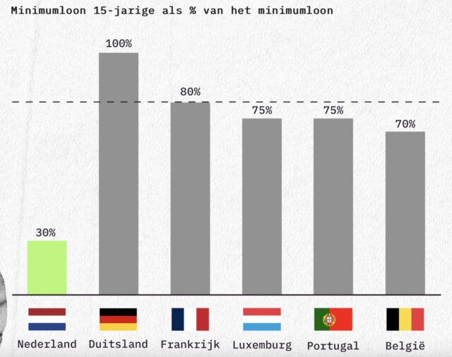 In Nederland verdient een 18-jarige slechts 50% van het volwassenen loon. In Ierland, het enige andere EU land met een minimumjeugdloon voor 18-plussers, is dat 80%. De groei van het minimumjeugdloon is de laatste jaren ook achtergebleven bij de ontwikkeling van de welvaart en het mediane loon in Nederland. Volgens de Europese richtlijn is afwijken van het normale minimumloon alleen toegestaan, als het een legitiem doel dient dat aantoonbaar helpt om het doel te behalen. ‘Het is echter twijfelachtig of dit voor Nederland het geval is’, aldus Vrijmoeth en Koopmans, auteurs van het binnenkort te verschijnen boek Machtige Mythes.