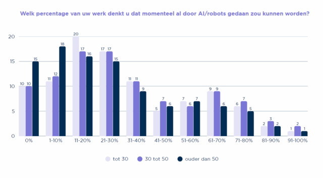 Opvallend, want op de vraag welk percentage van hun werk nú al door A.I. of robots kan worden uitgevoerd, zijn Nederlandse werkenden over het algemeen best openhartig, en schatten ze een behoorlijk aandeel in. Bijna de helft van hun werk (48%), kan een robot of A.I. net zo goed doen, schatten bijvoorbeeld communicatiemedewerkers en journalisten in. Maar ook HR-medewerkers denken bijvoorbeeld dat 35% van hun huidige werk te automatiseren zou zijn. Alleen in beroepen als installatie, reparatie en onderhoud, persoonlijke dienstverlening, verpleging en verzorging lijkt de menselijke touch inmiddels nog écht onmisbaar.