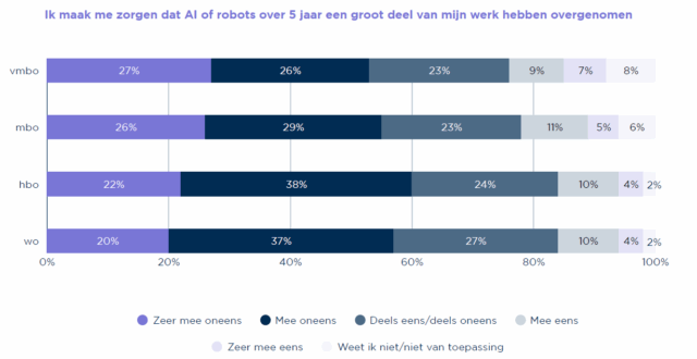 Vmbo’ers en mbo’ers denken veel vaker dat A.I. geen enkele impact heeft op hun werk.
