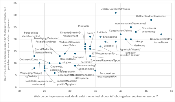 Het nieuwe onderzoek laat ook een opvallende kloof zien tussen verwachte impact en zorg over baanverlies in veel beroepen. In sectoren als ICT en consultancy verwachten medewerkers bijvoorbeeld veel effect van A.I. op hun dagelijkse werkzaamheden. Maar de zorgen over baanverlies? Die zijn hier niet bijster hoog. Professionals hier lijken blijkbaar veel vertrouwen te hebben in hun eigen aanpassingsvermogen. Omgekeerd is er in de persoonlijke dienstverlening (zoals kappers en schoonheidsspecialisten) en de juridische sector relatief juist veel ongerustheid, die niet altijd in verhouding staat tot de verwachte impact hier.